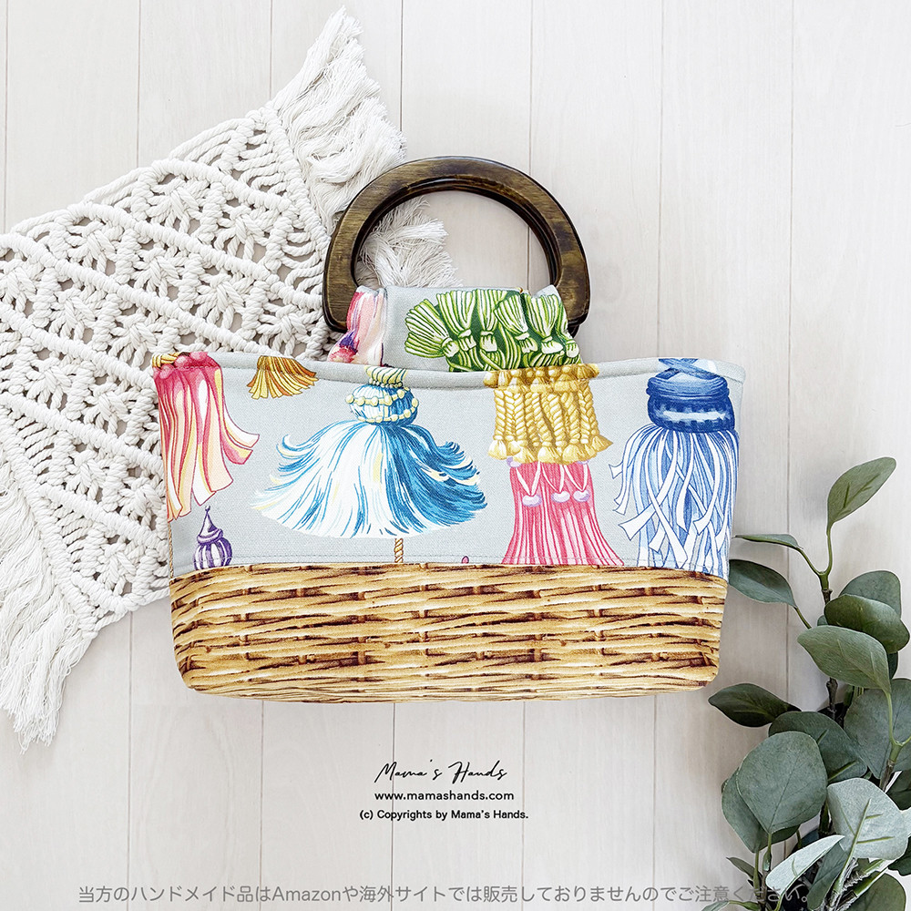 《南欧リゾート風 タッセル》スペイン製 カラフル 花柄 木の持ち手 小柄 トート 手提げ かごバック
